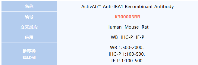 中枢神经系统疾病是一类影响脑和脊髓的复杂病理状态,涵盖阿尔茨海默病、帕金森病、脑卒中、多发性硬化等神经退行性、血管性及免疫介导的病变。这些疾病常伴随神经元丢失、突触功能障碍以及持续性的神经炎症反应,导致认知衰退、运动协调障碍等临床表现。小胶质细胞作为中枢神经系统中的主要免疫效应细胞,其活化与功能状态在疾病进程中起关键作用。IBA1(Ionized calcium-binding adapter molecule 1,离子化钙结合接头分子1)是小胶质细胞和单核/巨噬细胞系的特异性标志蛋白,能够稳定反映小胶质细胞的形态变化与激活水平。尽管IBA1并非致病因子,但因其高度特异性和敏感性,已成为研究神经炎症机制、评估疾病进展及治疗响应的重要工具,被广泛称为“小胶质细胞的分子名片"。小编本期推荐的明星抗体K300003RR,可是侦察IBA1蛋白的得力干将,让我们一起来认识下吧!
